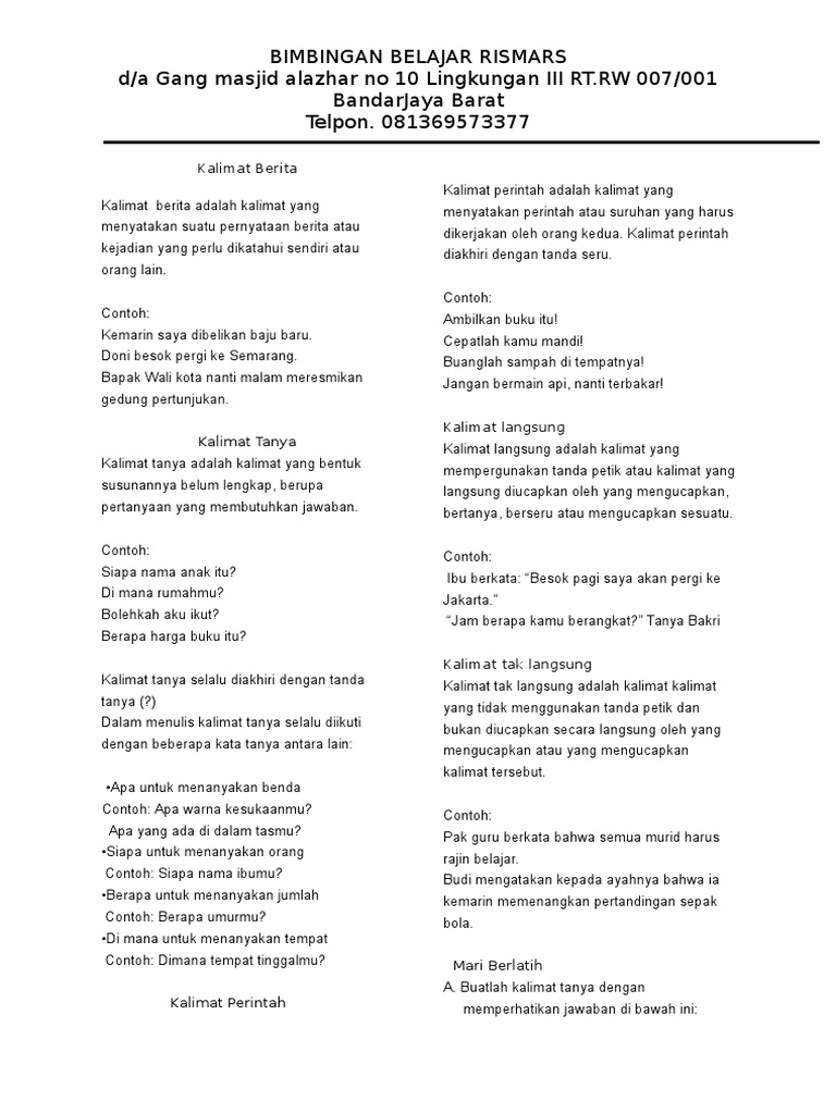 1 from Kalimat berita positif tidak memiliki pengingkaran sedangkan kalimat berita negatif memiliki kata pengingkaran yang ditandai dengan kata bukan, tidak dan lain. Penulisan kalimat yang benar diawali dengan huruf kapital atau huruf besar dan diakhiri dengan sebuah titik (.), tanda tanya(?), ataupun tanda struktur kalimat pada kalimat lengkap, minimal terdiri dari subyek (s) dan predikat (p). Ada contoh surat dinas resmi sekolah perhatikan contoh berikut! Penulisan yang benar 17 agustus 2007 13 maret 2007. Adapun contoh kalimat berita negatif yang diantaranya yaitu: Aisyah beritahukan mama bahwa tante tidak bisa datang. Pengertian dari kalimat efektif merupakan sebuah kalimat yang sesuai dengan kaidah tata bahasa yang baik dan benar, yang juga lengkap. Untuk lebih jelasnya, perhatikan contoh berikut.